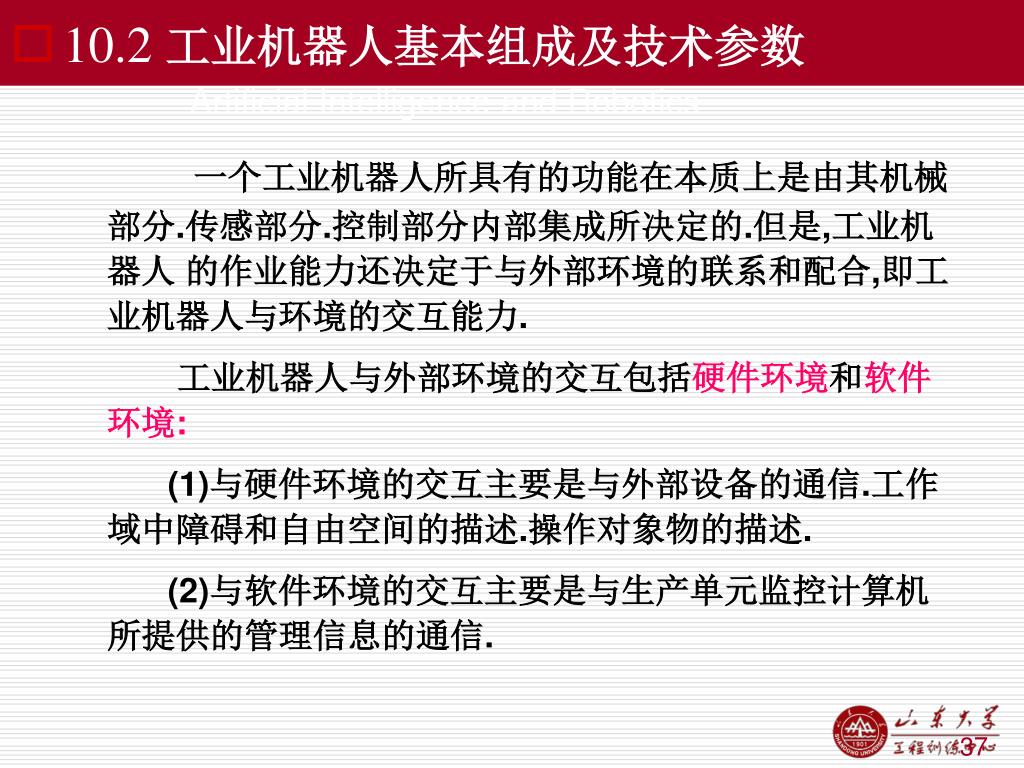 10.2 工业机器人基本组成及技术参数 一个工业机器人所具有的功能在本质上是由其机械部分.传感部分.控制部分内部集成所决定的.但是,工业机器人 的作业能力还决定于与外部环境的联系和配合,即工业机器人与环境的交互能力. 工业机器人与外部环境的交互包括硬件环境和软件环境: (1)与硬件环境的交互主要是与外部设备的通信.工作域中障碍和自由空间的描述.操作对象物的描述. (2)与软件环境的交互主要是与生产单元监控计算机所提供的管理信息的通信.