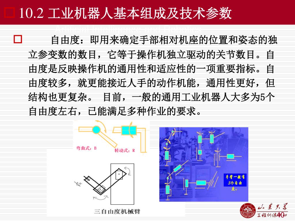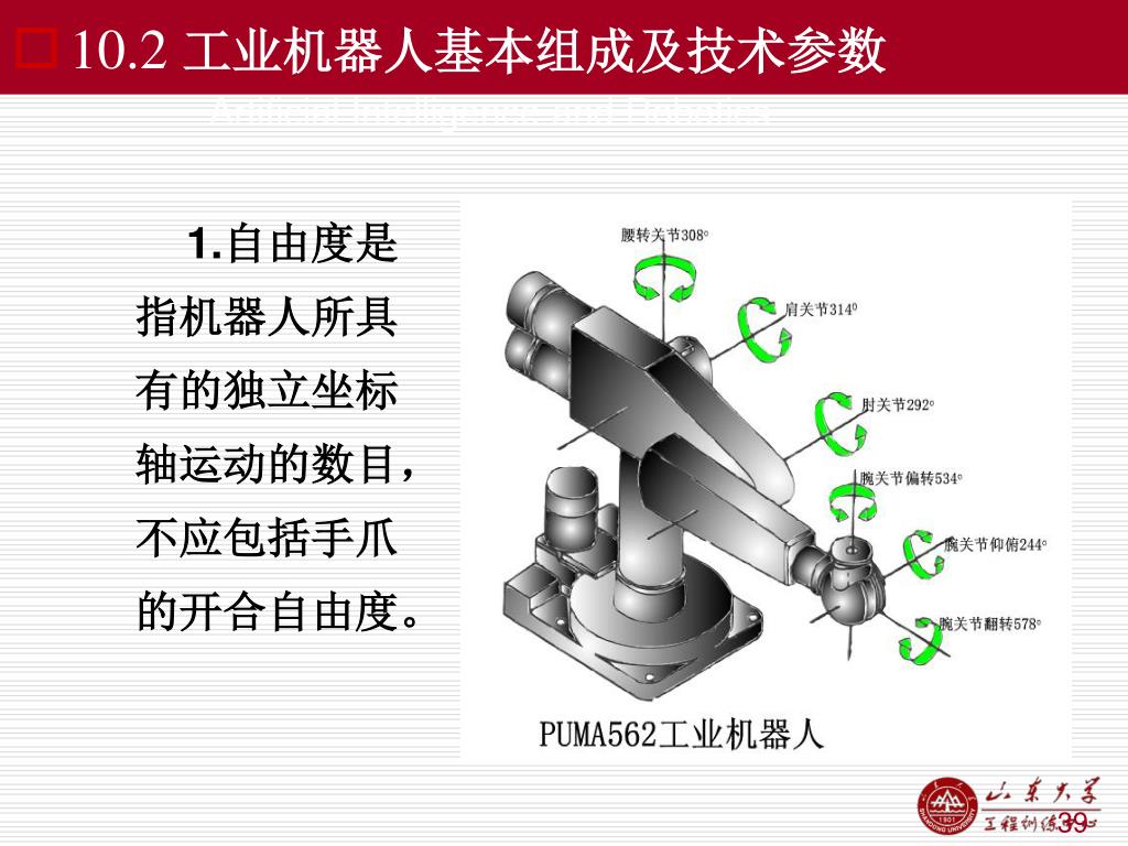 10.2 工业机器人基本组成及技术参数 1.自由度是指机器人所具有的独立坐标轴运动的数目,不应包括手爪的开合自由度。