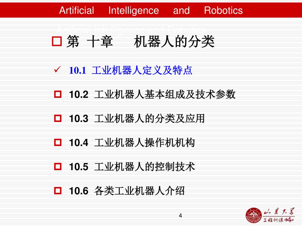 Artificial Intelligence and Robotics • 第 十章 工业机器人 • 10.1 工业机器人定义及特点 • 10.2 工业机器人基本组成及技术参数 • 10.3 工业机器人的分类及应用 • 10.4 工业机器人操作机机构 • 10.5 工业机器人的控制技术 • 10.6 各类工业机器人介绍 2014/9/19 3