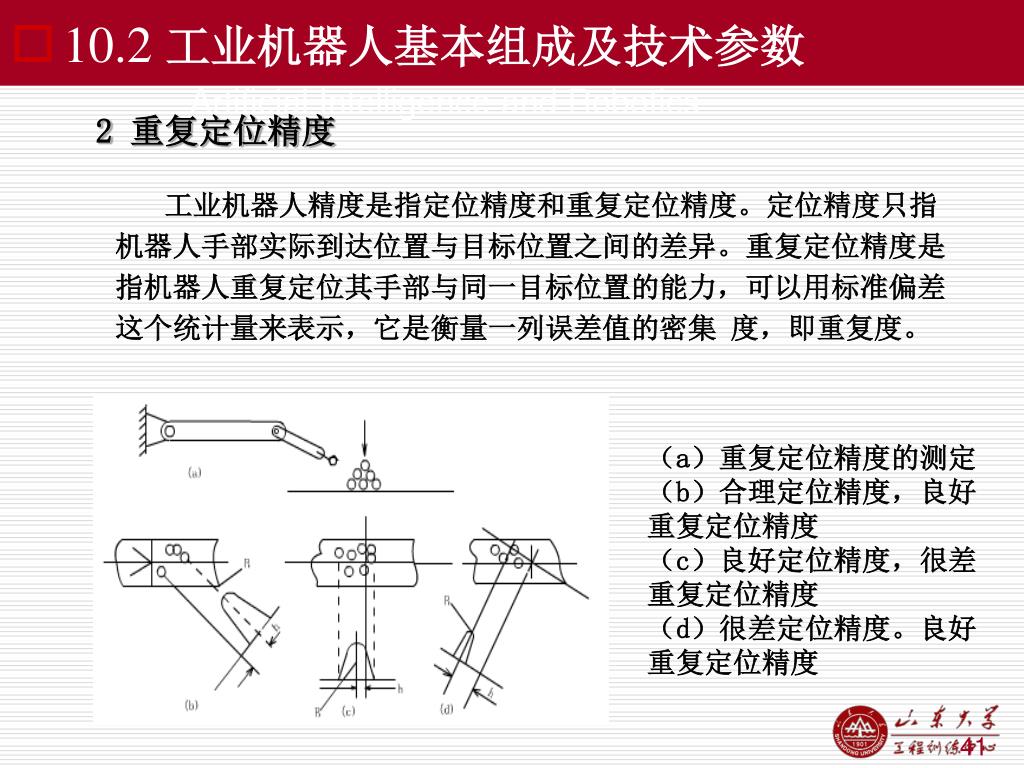 10.2 工业机器人基本组成及技术参数 工业机器人精度是指定位精度和重复定位精度。定位精度只指机器人手部实际到达位置与目标位置之间的差异。重复定位精度是指机器人重复定位其手部与同一目标位置的能力,可以用标准偏差这个统计量来表示,它是衡量一列误差值的密集 度,即重复度。 2 重复定位精度 (a)重复定位精度的测定 (b)合理定位精度,良好重复定位精度 (c)良好定位精度,很差重复定位精度 (d)很差定位精度。良好重复定位精度