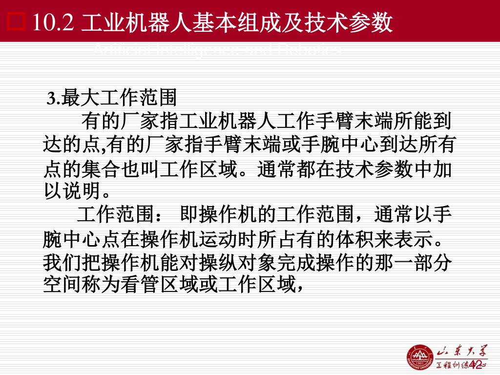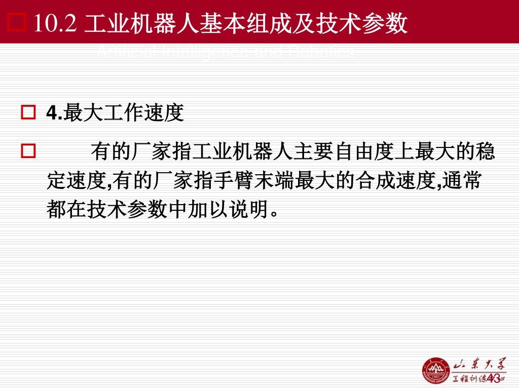 10.2 工业机器人基本组成及技术参数 • 4.最大工作速度 • 有的厂家指工业机器人主要自由度上最大的稳定速度,有的厂家指手臂末端最大的合成速度,通常都在技术参数中加以说明。