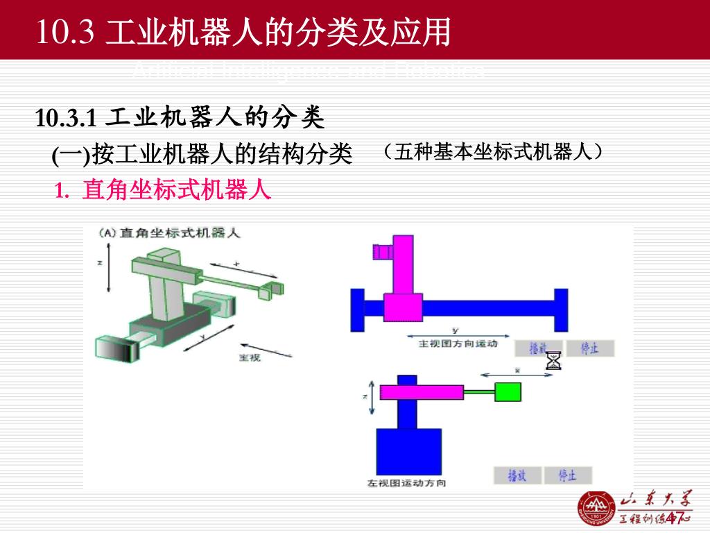 Artificial Intelligence and Robotics • 第 十章 工业机器人 • 10.1 工业机器人定义及特点 • 10.2 工业机器人基本组成及技术参数 • 10.3 工业机器人的分类及应用 • 10.4 工业机器人操作机机构 • 10.5 工业机器人的控制技术 • 10.6 各类工业机器人介绍 2014/9/19 46