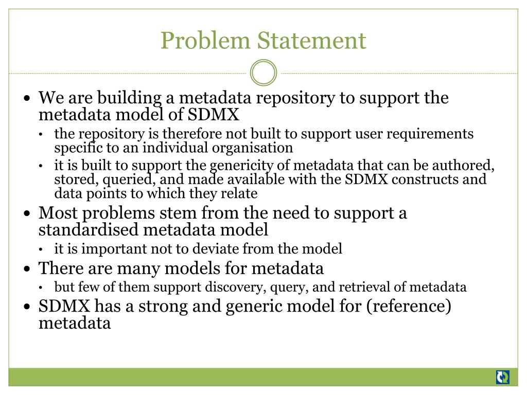 Problem Statement • We are building a metadata repository to support the metadata model of SDMX • the repository is therefore not built to support user requirements specific to an individual organisation • it is built to support the genericity of metadata that can be authored, stored, queried, and made available with the SDMX constructs and data points to which they relate • Most problems stem from the need to support a standardised metadata model • it is important not to deviate from the model • There are many models for metadata • but few of them support discovery, query, and retrieval of metadata • SDMX has a strong and generic model for (reference) metadata