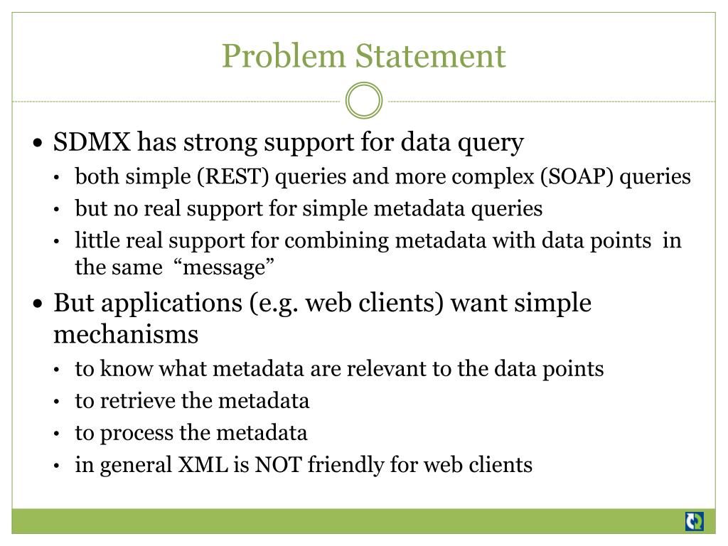 Problem Statement • SDMX has strong support for data query • both simple (REST) queries and more complex (SOAP) queries • but no real support for simple metadata queries • little real support for combining metadata with data points in the same “message” • But applications (e.g. web clients) want simple mechanisms • to know what metadata are relevant to the data points • to retrieve the metadata • to process the metadata • in general XML is NOT friendly for web clients