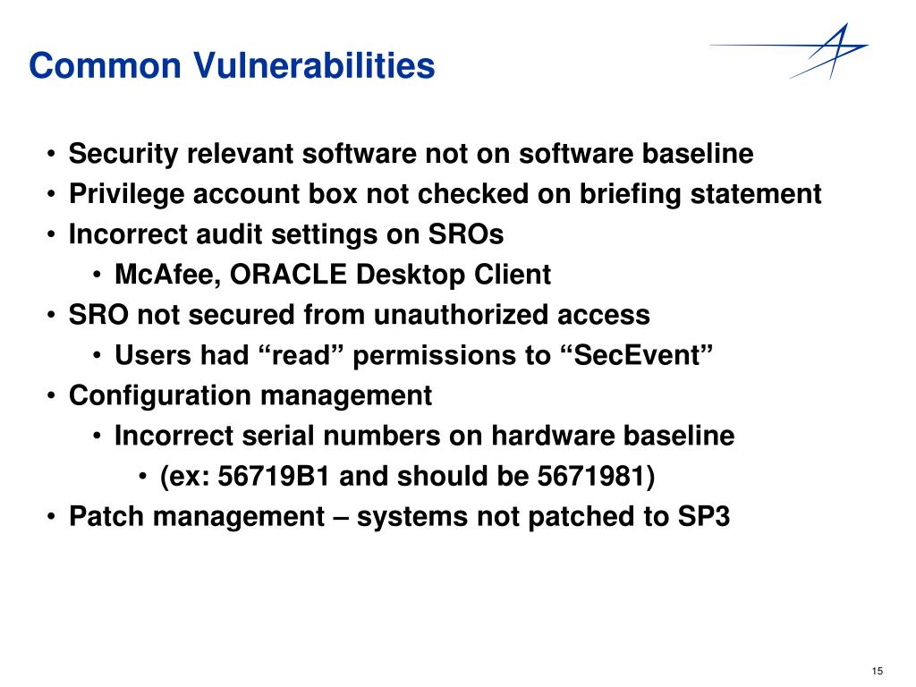 Common Vulnerabilities • Security relevant software not on software baseline • Privilege account box not checked on briefing statement • Incorrect audit settings on SROs • McAfee, ORACLE Desktop Client • SRO not secured from unauthorized access • Users had “read” permissions to “SecEvent” • Configuration management • Incorrect serial numbers on hardware baseline • (ex: 56719B1 and should be 5671981) • Patch management – systems not patched to SP3