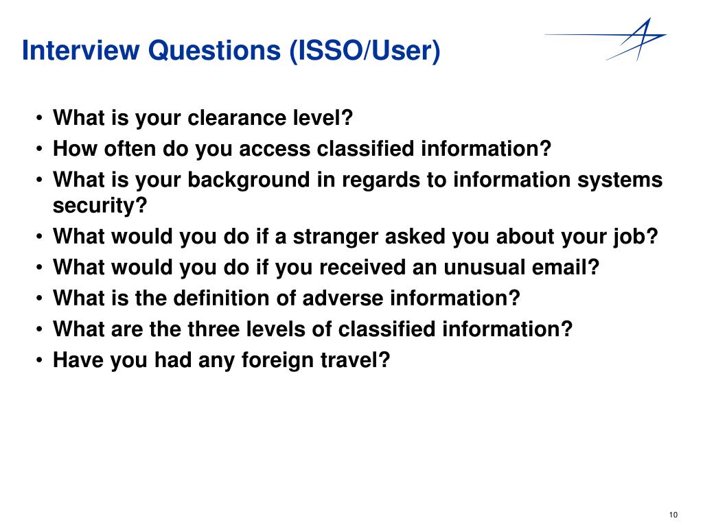 Interview Questions (ISSO/User) • What is your clearance level? • How often do you access classified information? • What is your background in regards to information systems security? • What would you do if a stranger asked you about your job? • What would you do if you received an unusual email? • What is the definition of adverse information? • What are the three levels of classified information? • Have you had any foreign travel?