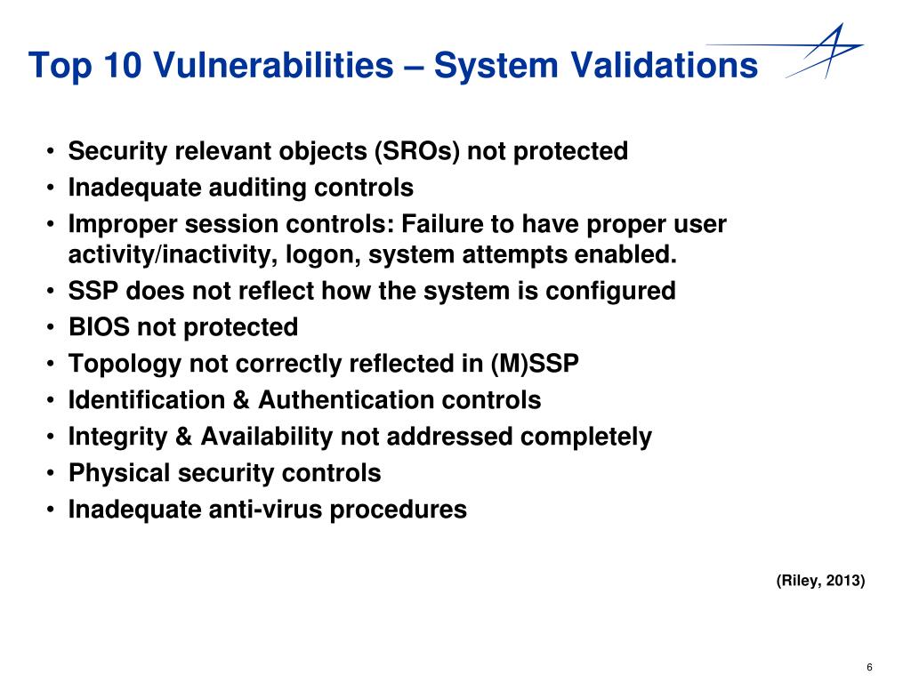 Top 10 Vulnerabilities – System Validations • Security relevant objects (SROs) not protected • Inadequate auditing controls • Improper session controls: Failure to have proper user activity/inactivity, logon, system attempts enabled. • SSP does not reflect how the system is configured • BIOS not protected • Topology not correctly reflected in (M)SSP • Identification & Authentication controls • Integrity & Availability not addressed completely • Physical security controls • Inadequate anti-virus procedures (Riley, 2013)