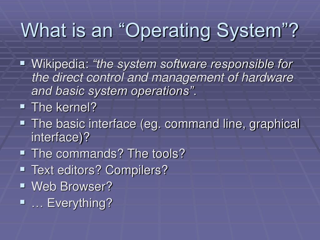 What is an “Operating System”? • Wikipedia: “the system software responsible for the direct control and management of hardware and basic system operations”. • The kernel? • The basic interface (eg. command line, graphical interface)? • The commands? The tools? • Text editors? Compilers? • Web Browser? • … Everything?
