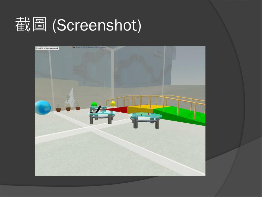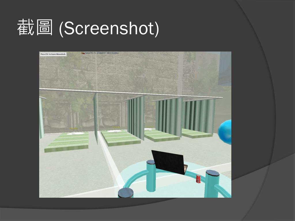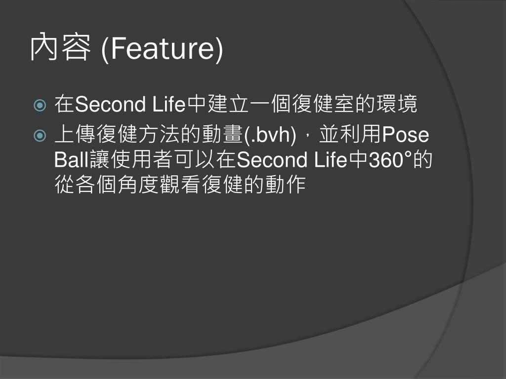 內容 (Feature) • 在Second Life中建立一個復健室的環境 • 上傳復健方法的動畫(.bvh),並利用Pose Ball讓使用者可以在Second Life中360°的從各個角度觀看復健的動作