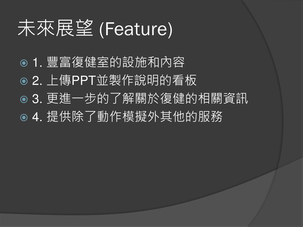 未來展望 (Feature) • 1. 豐富復健室的設施和內容 • 2. 上傳PPT並製作說明的看板 • 3. 更進一步的了解關於復健的相關資訊 • 4. 提供除了動作模擬外其他的服務