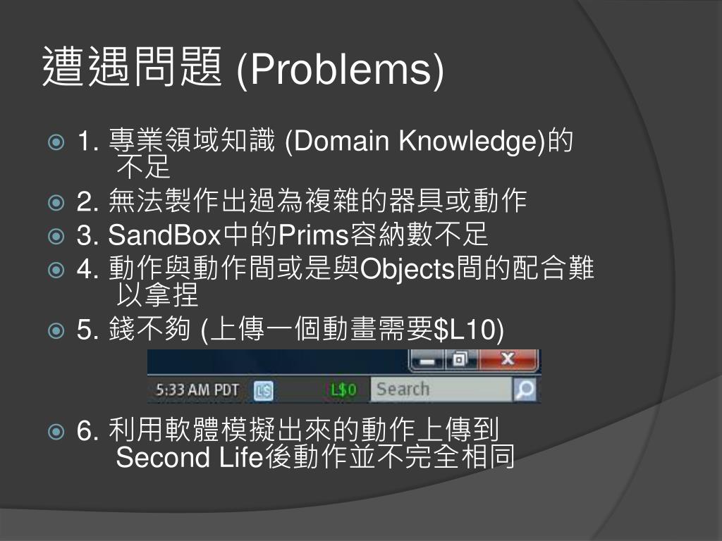 遭遇問題 (Problems) • 1. 專業領域知識 (Domain Knowledge)的不足 • 2. 無法製作出過為複雜的器具或動作 • 3.SandBox中的Prims容納數不足 • 4. 動作與動作間或是與Objects間的配合難以拿捏 • 5.錢不夠 (上傳一個動畫需要$L10) • 6. 利用軟體模擬出來的動作上傳到 Second Life後動作並不完全相同