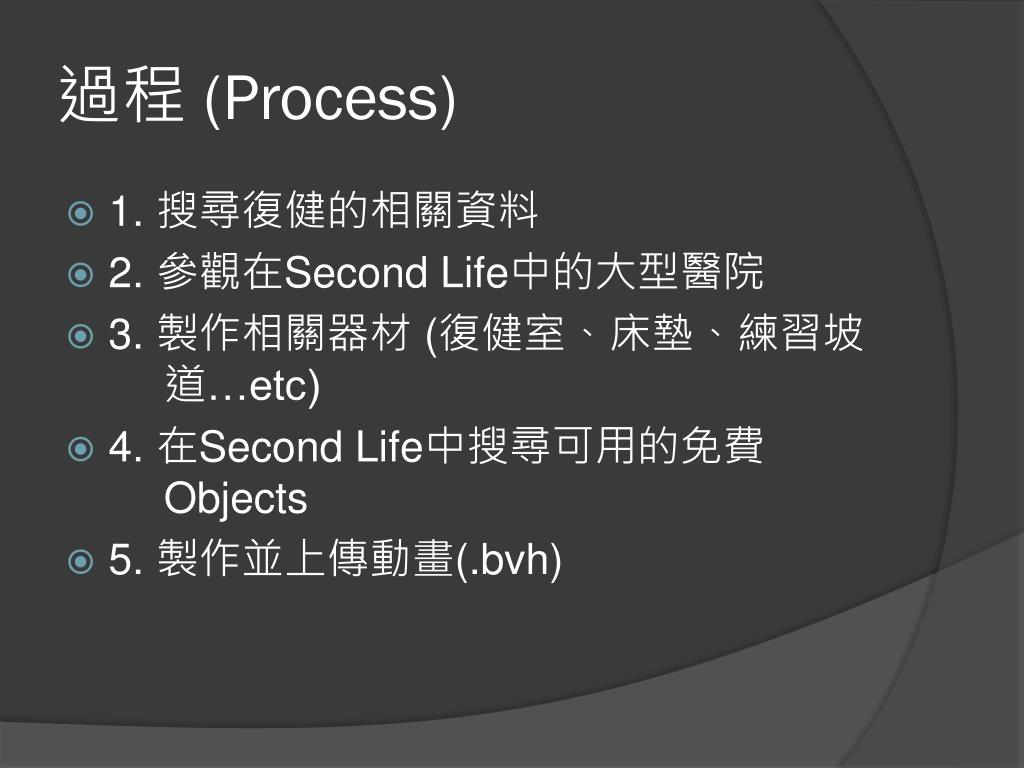 過程 (Process) • 1. 搜尋復健的相關資料 • 2. 參觀在Second Life中的大型醫院 • 3. 製作相關器材 (復健室、床墊、練習坡道…etc) • 4. 在Second Life中搜尋可用的免費 Objects • 5. 製作並上傳動畫(.bvh)
