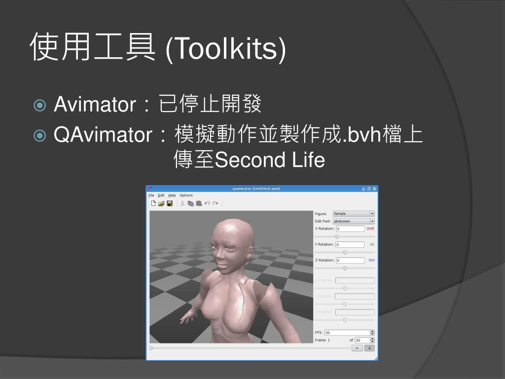 使用工具 (Toolkits) • Avimator:已停止開發 • QAvimator:模擬動作並製作成.bvh檔上傳至Second Life