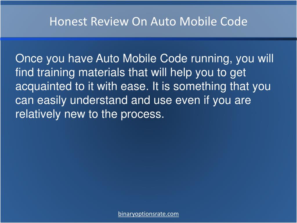 Honest Review On Auto Mobile Code Once you have Auto Mobile Code running, you will find training materials that will help you to get acquainted to it with ease. It is something that you can easily understand and use even if you are relatively new to the process. binaryoptionsrate.com