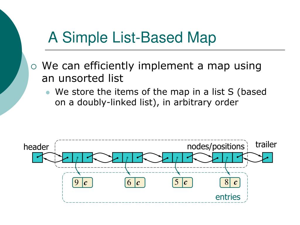 We can efficiently implement a map using an unsorted list We store the items of the map in a list S (based on a doubly-linked list), in arbitrary order A Simple List-Based Map trailer nodes/positions header c c 5 8 c c 9 6 entries
