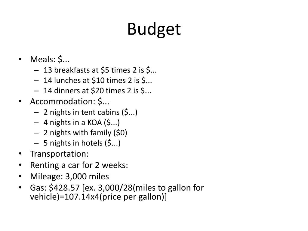 Budget • Meals: $... • 13 breakfasts at $5 times 2 is $... • 14 lunches at $10 times 2 is $... • 14 dinners at $20 times 2 is $... • Accommodation: $... • 2 nights in tent cabins ($...) • 4 nights in a KOA ($...) • 2 nights with family ($0) • 5 nights in hotels ($...) • Transportation: • Renting a car for 2 weeks: • Mileage: 3,000 miles • Gas: $428.57 [ex. 3,000/28(miles to gallon for vehicle)=107.14x4(price per gallon)]