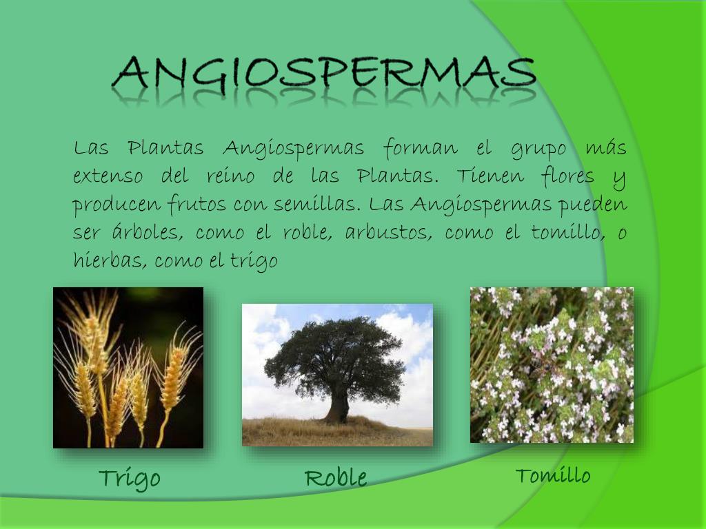 Las Plantas Angiospermas forman el grupo más extenso del reino de las Plantas. Tienen flores y producen frutos con semillas. Las Angiospermas pueden ser árboles, como el roble, arbustos, como el tomillo, o hierbas, como el trigo Angiospermas Trigo Roble Tomillo