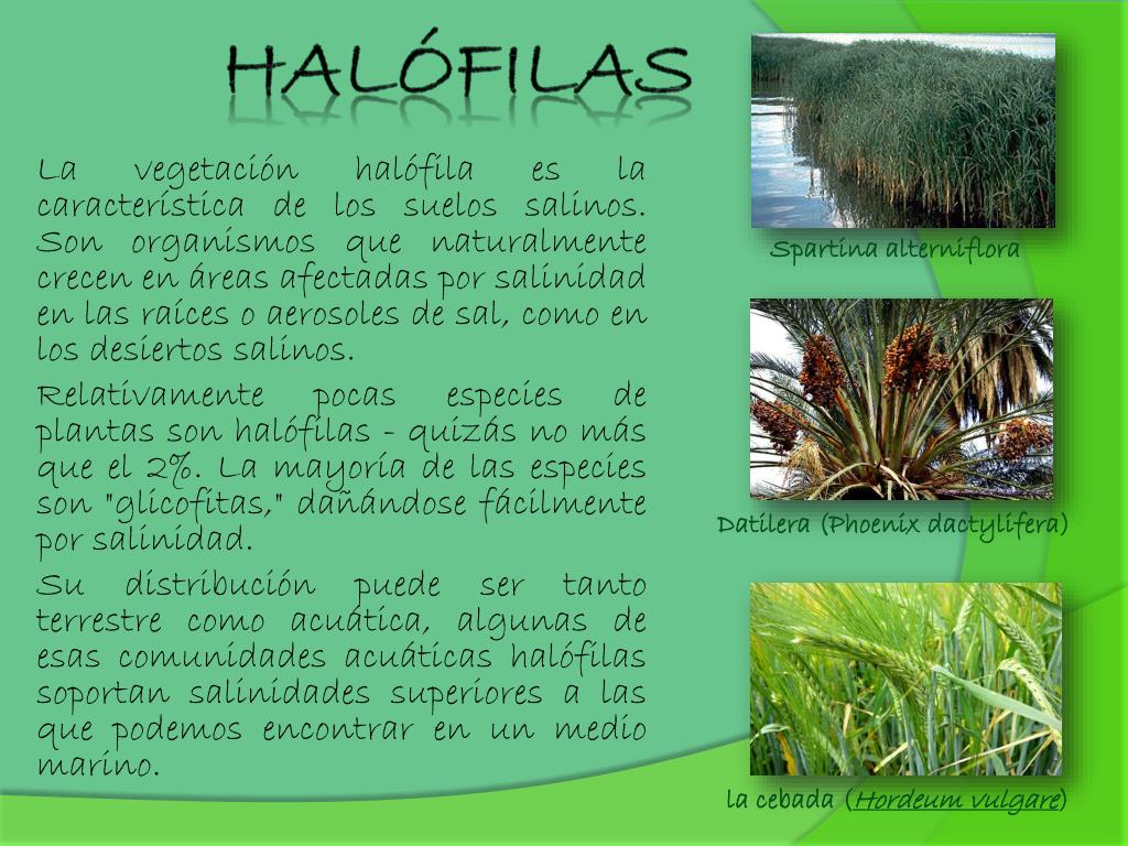 Spartinaalterniflora La vegetación halófila es la característica de los suelos salinos. Son organismos que naturalmente crecen en áreas afectadas por salinidad en las raíces o aerosoles de sal, como en los desiertos salinos. Relativamente pocas especies de plantas son halófilas - quizás no más que el 2%. La mayoría de las especies son "glicofitas," dañándose fácilmente por salinidad. Su distribución puede ser tanto terrestre como acuática, algunas de esas comunidades acuáticas halófilas soportan salinidades superiores a las que podemos encontrar en un medio marino. Halófilas Datilera (Phoenix dactylifera) la cebada (Hordeumvulgare)