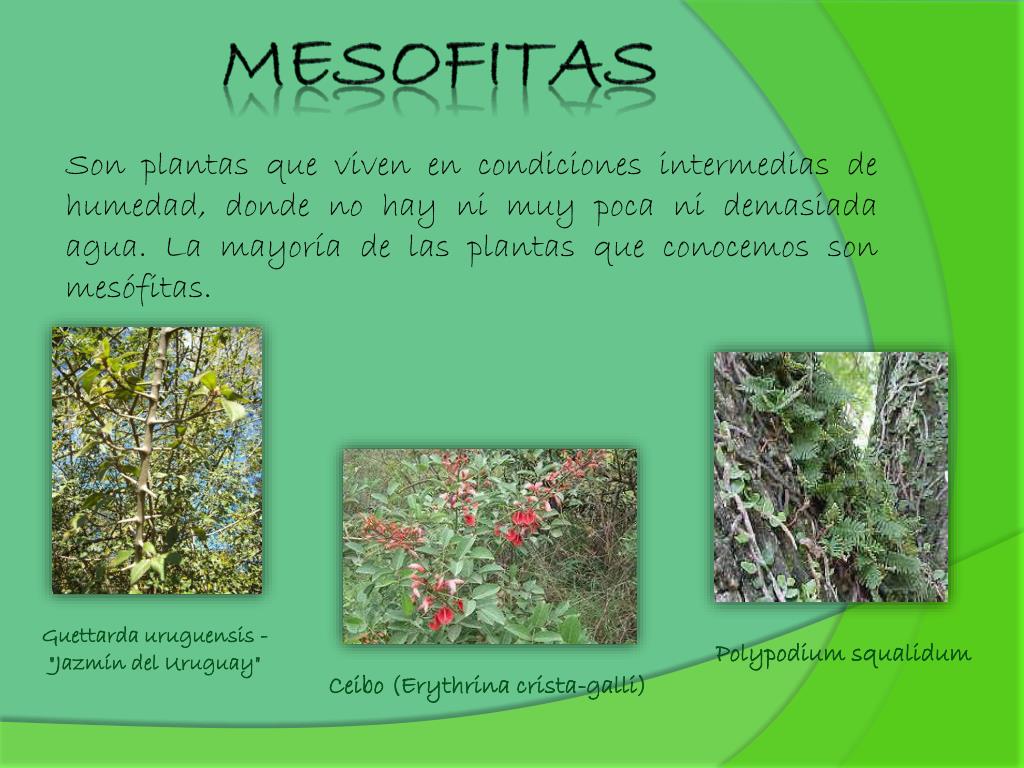 Son plantas que viven en condiciones intermedias de humedad, donde no hay ni muy poca ni demasiada agua. La mayoría de las plantas que conocemos son mesófitas. MESOFITAS Guettarda uruguensis - "Jazmín del Uruguay" Polypodium squalidum Ceibo (Erythrina crista-galli)