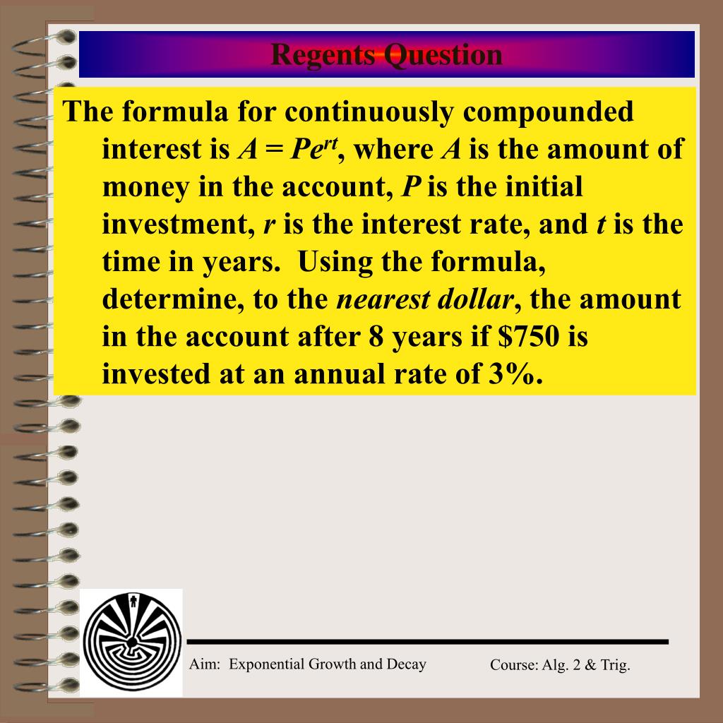 Regents Question The formula for continuously compounded interest is A =Pert, where A is the amount of money in the account, P is the initial investment, r is the interest rate, and t is the time in years. Using the formula, determine, to the nearest dollar, the amount in the account after 8 years if $750 is invested at an annual rate of 3%.