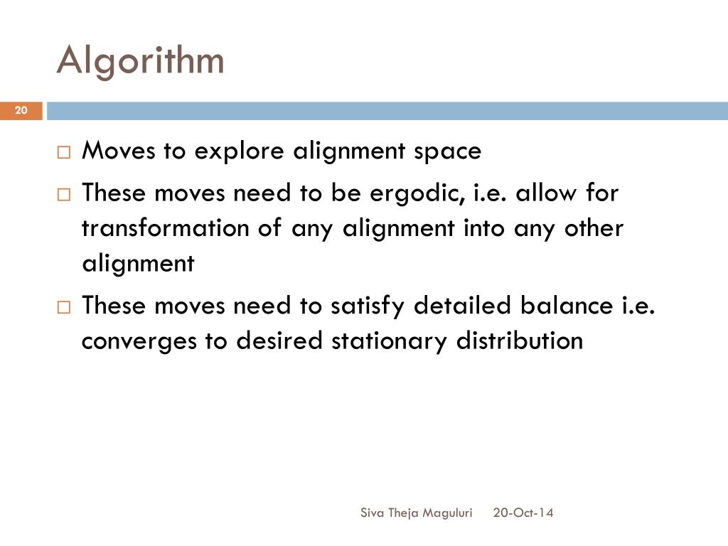Algorithm • Moves to explore alignment space • These moves need to be ergodic, i.e. allow for transformation of any alignment into any other alignment • These moves need to satisfy detailed balance i.e. converges to desired stationary distribution Siva Theja Maguluri