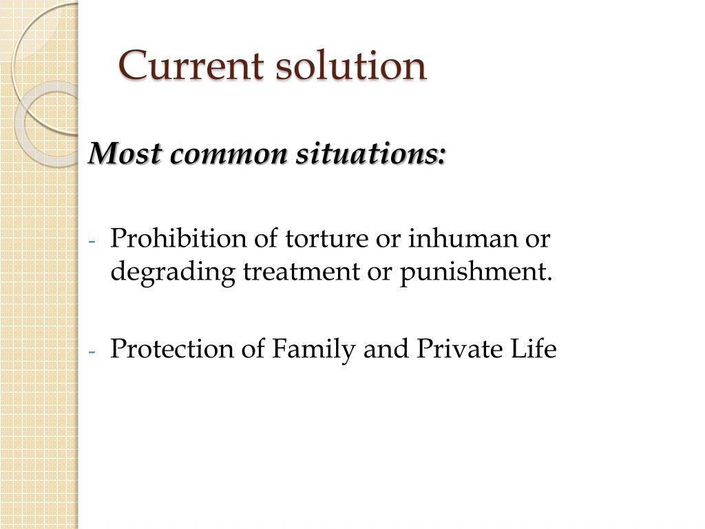Currentsolution Most common situations: • Prohibition of torture or inhuman or degrading treatment or punishment. • Protection of Family and PrivateLife