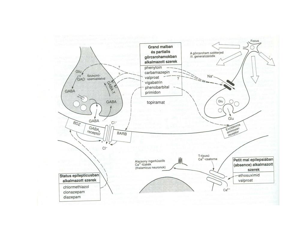 Gyógyszerek • csökkentik a sejtek magas frekvenciájú, repetatív tüzelést / növelik a Na+ csatornák inaktivált állapotból való visszatérésének refrakter idejét • phenobarbital(SEVENAL tabletta, SEVENALETTA tabletta) • primidon (SERTAN tabletta) • phenytoin(DIPHEDAN tabletta) • carbamazepin(AZEPAL tabletta, NEUROTOP tabletta, STAZEPINE tabletta,TEGRETOL szirup/tabletta/végbélkúp, TIMONIL tabletta) • oxcarbazepin (TRILEPTAL tabletta) • lamotrigin(LAMICTAL tabletta)
