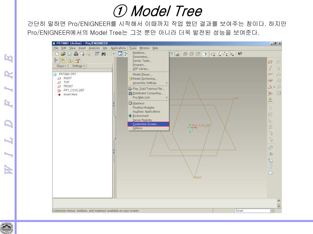 간단히 말하면 Pro/ENIGNEER를 시작해서 이때까지 작업 했던 결과를 보여주는 창이다. 하지만 Pro/ENIGNEER에서의 Model Tree는 그것 뿐만 아니라 더욱 발전된 성능을 보여준다. ① Model Tree