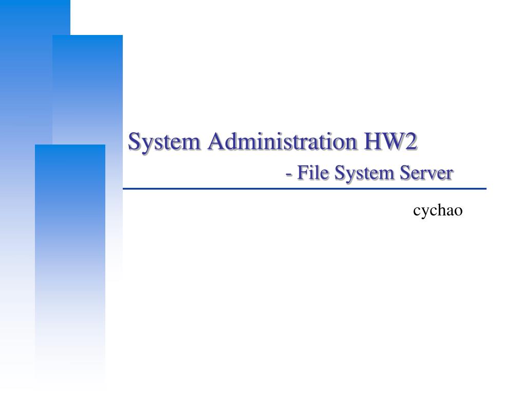 System Administration HW2 - File System Server. cychao. FTP. Install a FTP server for FreeBSD Pure-FTPd: /usr/ports/ftp/pure-ftpd/ ProFTPD: /usr/ports/ftp/proftpd/ Settings Anonymous Login Chrooted ( /home/ftp is your root directory) Can download from /home/ftp/public