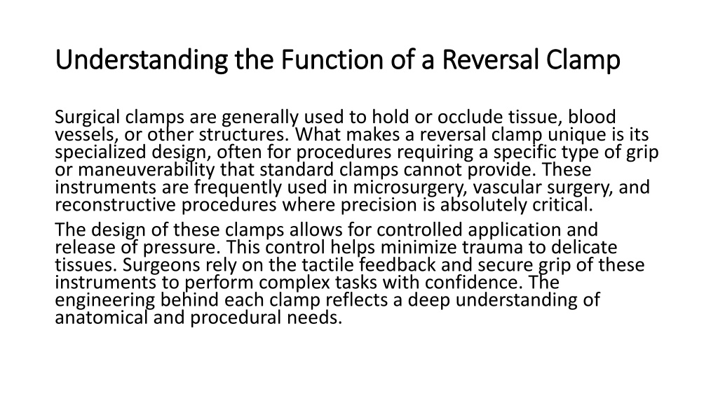 Understanding the Function of a Reversal Clamp Surgical clamps are generally used to hold or occlude tissue, blood vessels, or other structures. What makes a reversal clamp unique is its specialized design, often for procedures requiring a specific type of grip or maneuverability that standard clamps cannot provide. These instruments are frequently used in microsurgery, vascular surgery, and reconstructive procedures where precision is absolutely critical. The design of these clamps allows for controlled application and release of pressure. This control helps minimize trauma to delicate tissues. Surgeons rely on the tactile feedback and secure grip of these instruments to perform complex tasks with confidence. The engineering behind each clamp reflects a deep understanding of anatomical and procedural needs.