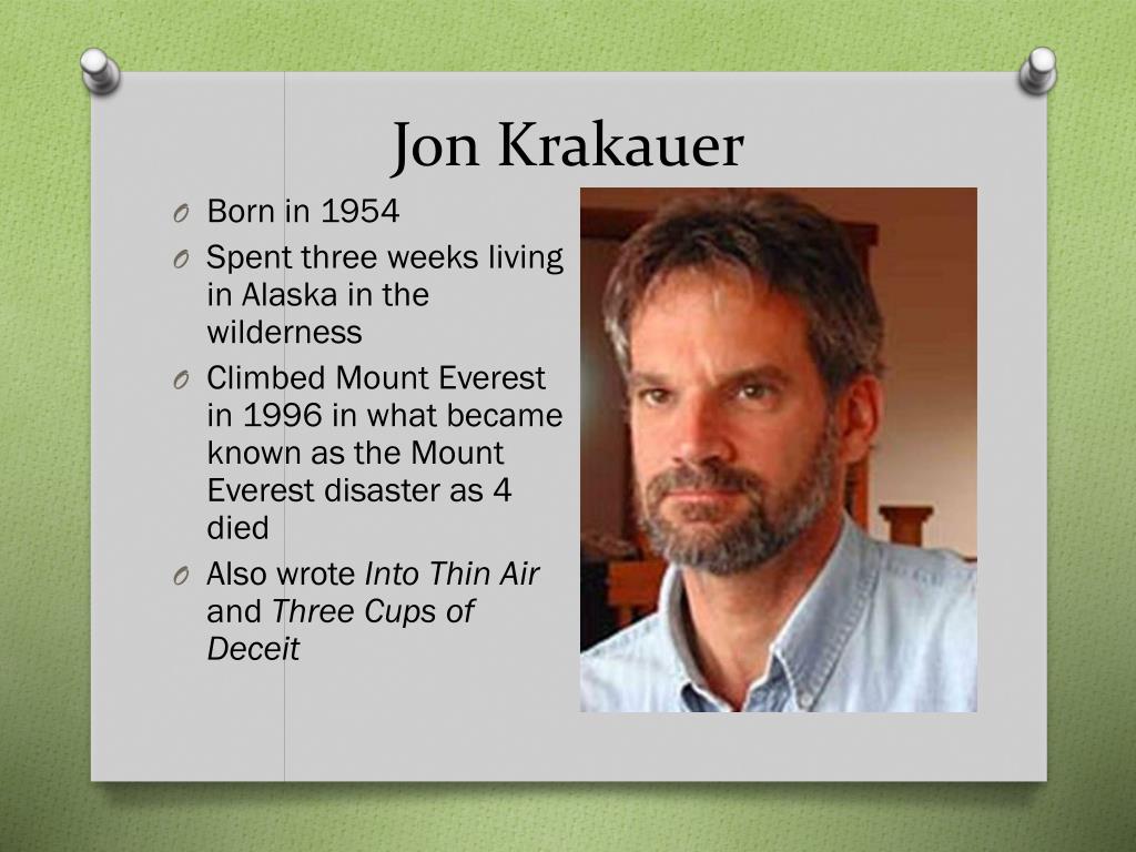 Jon Krakauer • Born in 1954 • Spent three weeks living in Alaska in the wilderness • Climbed Mount Everest in 1996 in what became known as the Mount Everest disaster as 4 died • Also wrote Into Thin Air and Three Cups of Deceit