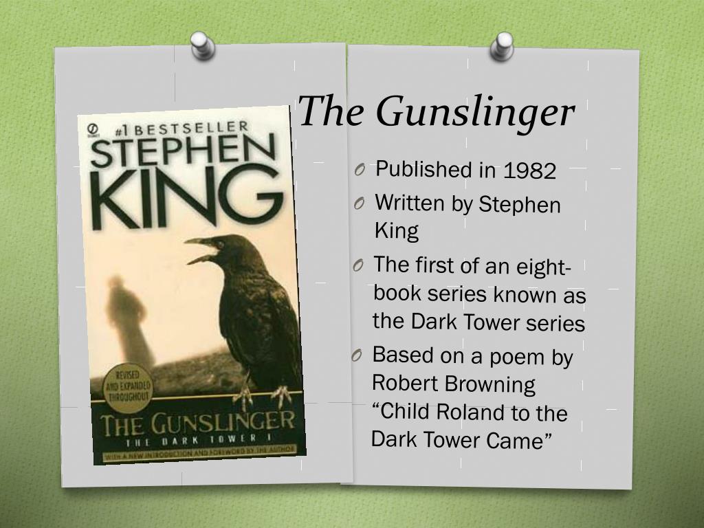 The Gunslinger • Published in 1982 • Written by Stephen King • The first of an eight-book series known as the Dark Tower series • Based on a poem by Robert Browning “Child Roland to the Dark Tower Came”