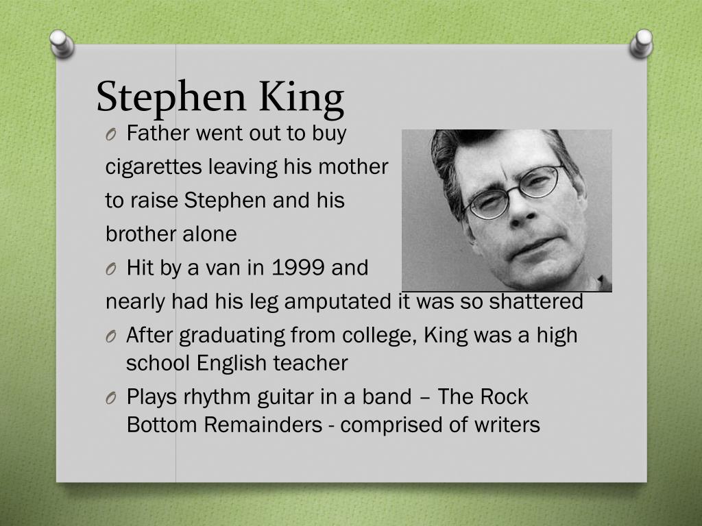 Stephen King • Father went out to buy cigarettes leaving his mother to raise Stephen and his brother alone • Hit by a van in 1999 and nearly had his leg amputated it was so shattered • After graduating from college, King was a high school English teacher • Plays rhythm guitar in a band – The Rock Bottom Remainders - comprised of writers