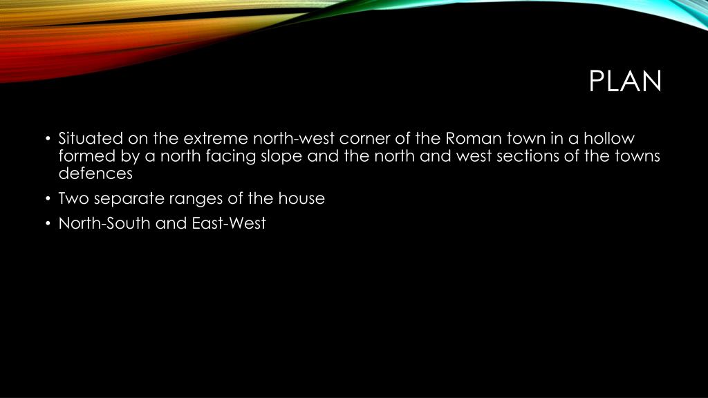 Plan • Situated on the extreme north-west corner of the Roman town in a hollow formed by a north facing slope and the north and west sections of the towns defences • Two separate ranges of the house • North-South and East-West