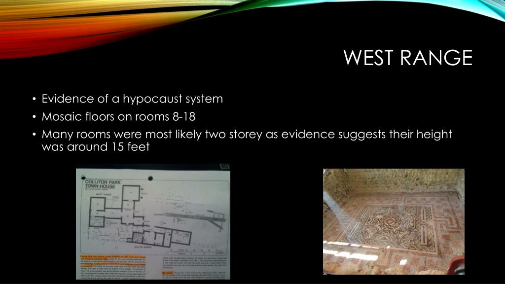 West Range • Evidence of a hypocaust system • Mosaic floors on rooms 8-18 • Many rooms were most likely two storey as evidence suggests their height was around 15 feet