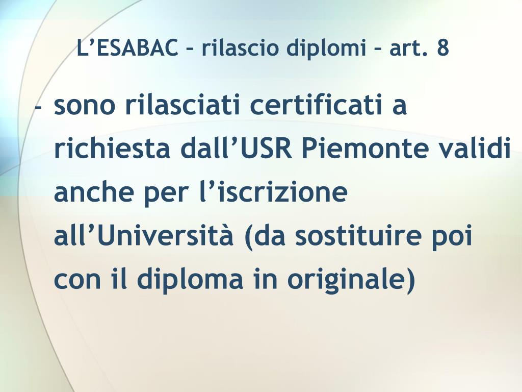 L’ESABAC – rilascio diplomi – art. 8 - sono rilasciati certificati a richiesta dall’USR Piemonte validi anche per l’iscrizione all’Università (da sostituire poi con il diploma in originale)