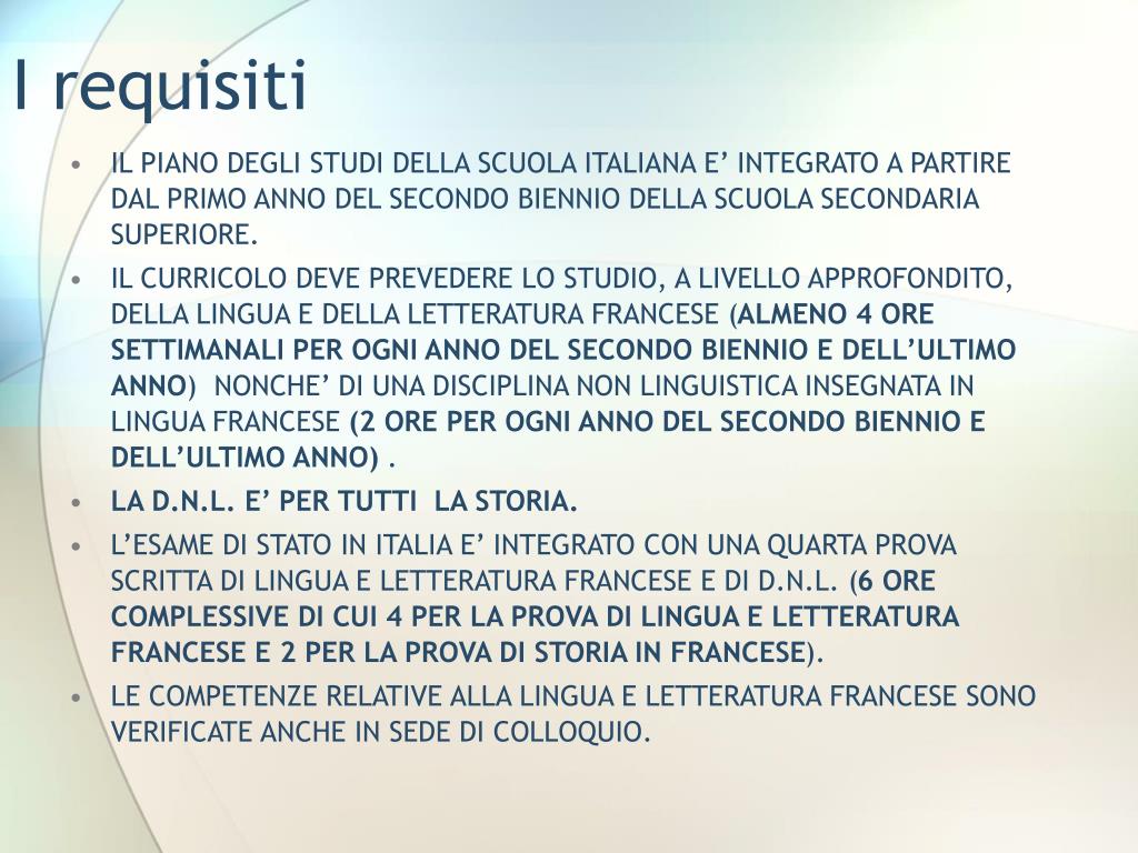 I requisiti • IL PIANO DEGLI STUDI DELLA SCUOLA ITALIANA E’ INTEGRATO A PARTIRE DAL PRIMO ANNO DEL SECONDO BIENNIO DELLA SCUOLA SECONDARIA SUPERIORE. • IL CURRICOLO DEVE PREVEDERE LO STUDIO, A LIVELLO APPROFONDITO, DELLA LINGUA E DELLA LETTERATURA FRANCESE (ALMENO 4 ORE SETTIMANALI PER OGNI ANNO DEL SECONDO BIENNIO E DELL’ULTIMO ANNO) NONCHE’ DI UNA DISCIPLINA NON LINGUISTICA INSEGNATA IN LINGUA FRANCESE (2 ORE PER OGNI ANNO DEL SECONDO BIENNIO E DELL’ULTIMO ANNO) . • LA D.N.L. E’ PER TUTTI LA STORIA. • L’ESAME DI STATO IN ITALIA E’ INTEGRATO CON UNA QUARTA PROVA SCRITTA DI LINGUA E LETTERATURA FRANCESE E DI D.N.L. (6 ORE COMPLESSIVE DI CUI 4 PER LA PROVA DI LINGUA E LETTERATURA FRANCESE E 2 PER LA PROVA DI STORIA IN FRANCESE). • LE COMPETENZE RELATIVE ALLA LINGUA E LETTERATURA FRANCESE SONO VERIFICATE ANCHE IN SEDE DI COLLOQUIO.