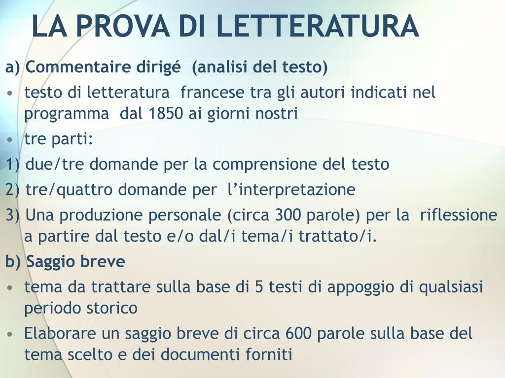 LA PROVA DI LETTERATURA a) Commentaire dirigé (analisi del testo) • testo di letteratura francese tra gli autori indicati nel programma dal 1850 ai giorni nostri • tre parti: 1) due/tre domande per la comprensione del testo 2) tre/quattro domande per l’interpretazione 3) Una produzione personale (circa 300 parole) per la riflessione a partire dal testo e/o dal/i tema/i trattato/i. b) Saggio breve • tema da trattare sulla base di 5 testi di appoggio di qualsiasi periodo storico • Elaborare un saggio breve di circa 600 parole sulla base del tema scelto e dei documenti forniti