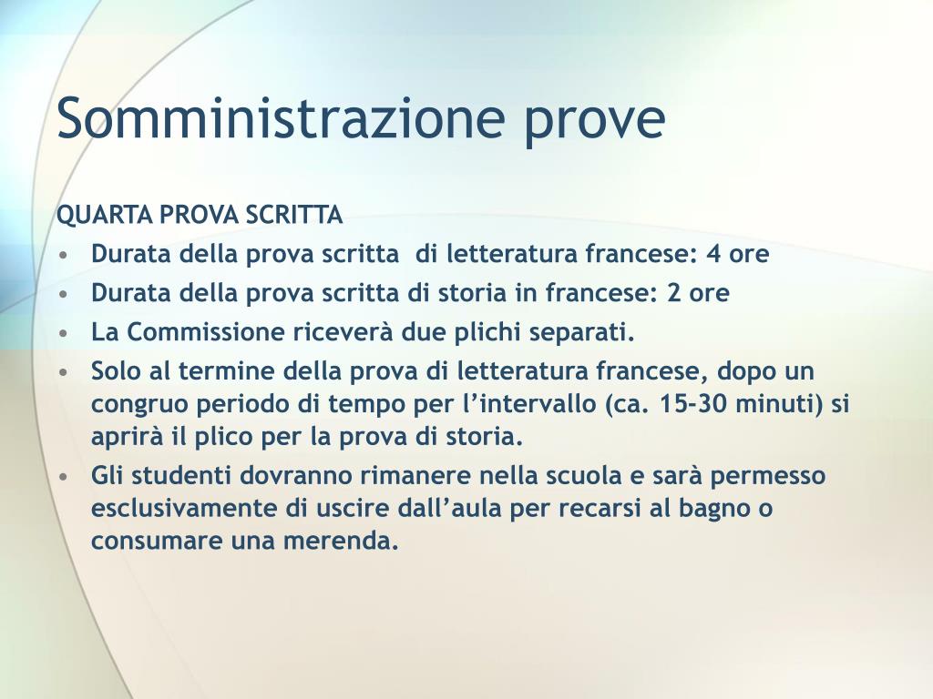 Somministrazione prove QUARTA PROVA SCRITTA • Durata della prova scritta di letteratura francese: 4 ore • Durata della prova scritta di storia in francese: 2 ore • La Commissione riceverà due plichi separati. • Solo al termine della prova di letteratura francese, dopo un congruo periodo di tempo per l’intervallo (ca. 15-30 minuti) si aprirà il plico per la prova di storia. • Gli studenti dovranno rimanere nella scuola e sarà permesso esclusivamente di uscire dall’aula per recarsi al bagno o consumare una merenda.