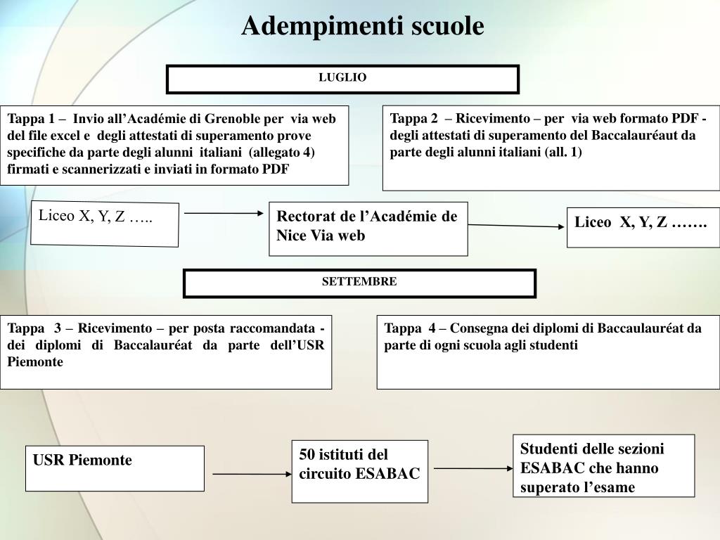 Adempimenti scuole LUGLIO Tappa 2 – Ricevimento – per via web formato PDF - degli attestati di superamento del Baccalauréaut da parte degli alunni italiani (all. 1) Tappa 1 – Invio all’Académie di Grenoble per via web del file excel e degli attestati di superamento prove specifiche da parte degli alunni italiani (allegato 4) firmati e scannerizzati e inviati in formato PDF Liceo X, Y, Z ….. Rectorat de l’Académie de Nice Via web Liceo X, Y, Z ……. SETTEMBRE Tappa 3 – Ricevimento – per posta raccomandata - dei diplomi di Baccalauréat da parte dell’USR Piemonte Tappa 4 – Consegna dei diplomi di Baccaulauréat da parte di ogni scuola agli studenti Studenti delle sezioni ESABAC che hanno superato l’esame 50 istituti del circuito ESABAC USR Piemonte