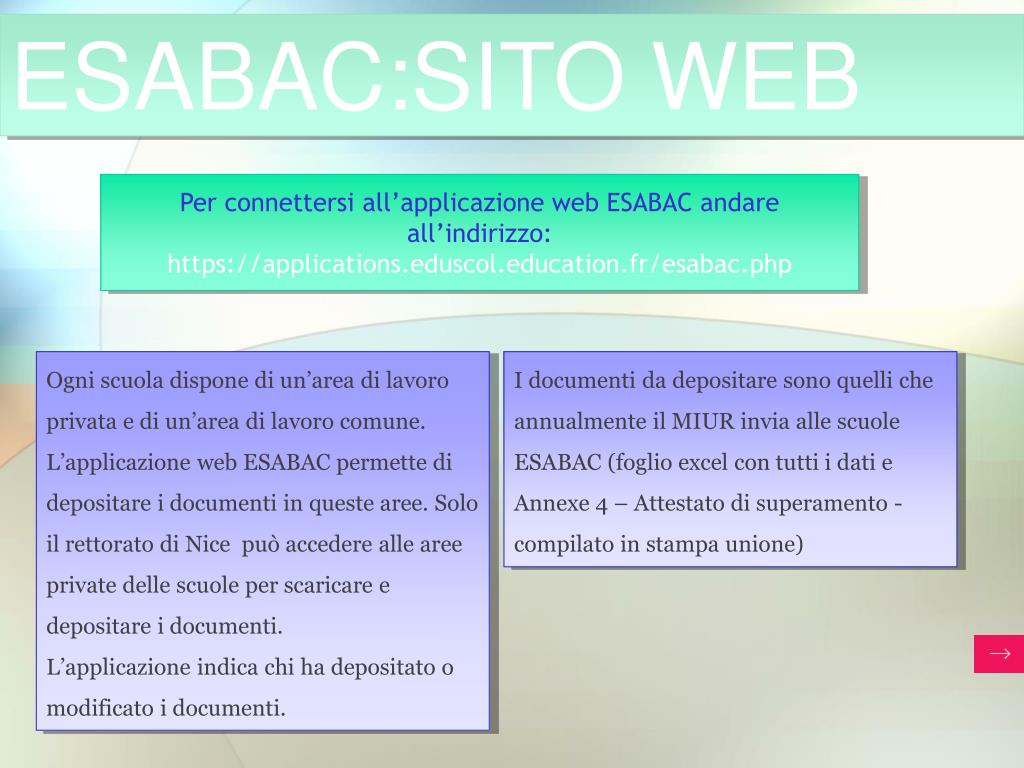 ESABAC:SITO WEB Per connettersi all’applicazione web ESABAC andare all’indirizzo: https://applications.eduscol.education.fr/esabac.php Ogni scuola dispone di un’area di lavoro privata e di un’area di lavoro comune. L’applicazione web ESABAC permette di depositare i documenti in queste aree. Solo il rettorato di Nice può accedere alle aree private delle scuole per scaricare e depositare i documenti. L’applicazione indica chi ha depositato o modificato i documenti. I documenti da depositare sono quelli che annualmente il MIUR invia alle scuole ESABAC (foglio excel con tutti i dati e Annexe 4 – Attestato di superamento - compilato in stampa unione)