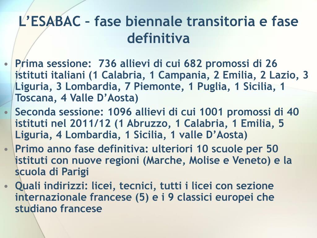 L’ESABAC – fase biennale transitoria e fase definitiva • Prima sessione: 736 allievi di cui 682 promossi di 26 istituti italiani (1 Calabria, 1 Campania, 2 Emilia, 2 Lazio, 3 Liguria, 3 Lombardia, 7 Piemonte, 1 Puglia, 1 Sicilia, 1 Toscana, 4 Valle D’Aosta) • Seconda sessione: 1096 allievi di cui 1001 promossi di 40 istituti nel 2011/12 (1 Abruzzo, 1 Calabria, 1 Emilia, 5 Liguria, 4 Lombardia, 1 Sicilia, 1 valle D’Aosta) • Primo anno fase definitiva: ulteriori 10 scuole per 50 istituti con nuove regioni (Marche, Molise e Veneto) e la scuola di Parigi • Quali indirizzi: licei, tecnici, tutti i licei con sezione internazionale francese (5) e i 9 classici europei che studiano francese