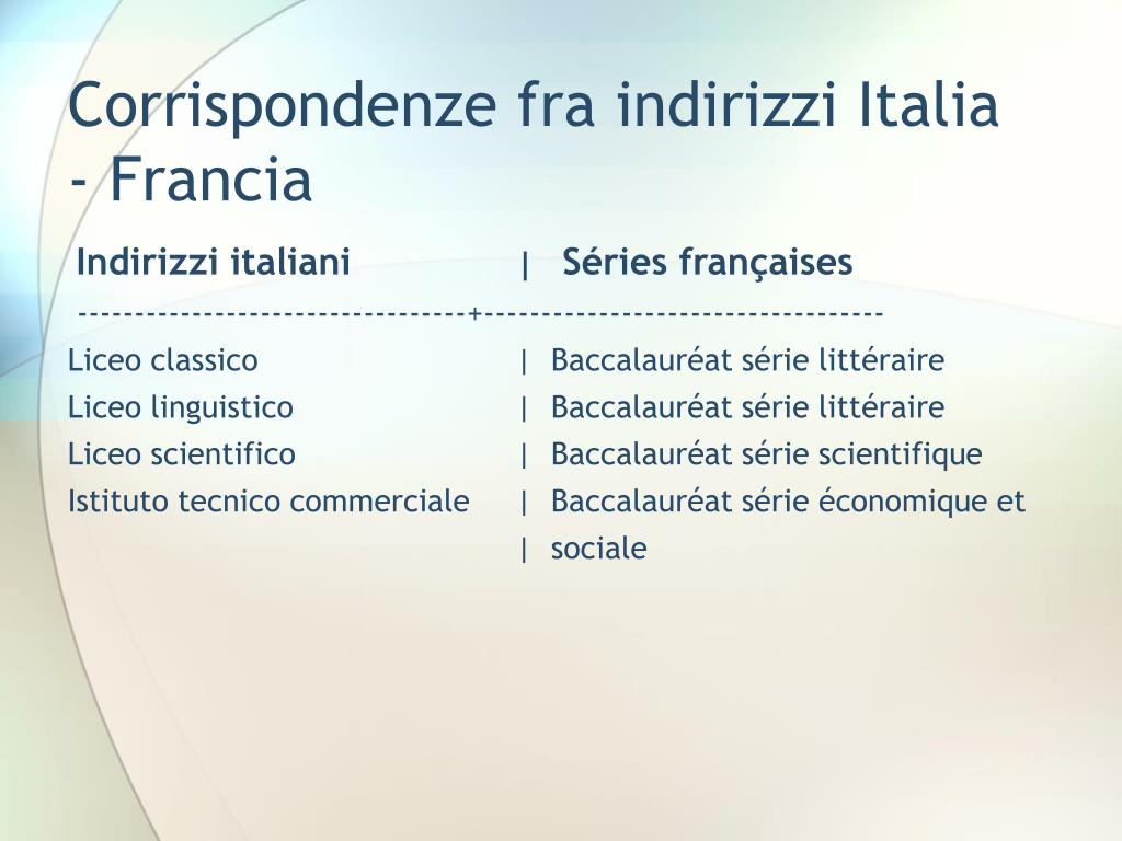 Corrispondenze fra indirizzi Italia - Francia Indirizzi italiani | Séries françaises ----------------------------------+----------------------------------- Liceo classico | Baccalauréat série littéraire Liceo linguistico | Baccalauréat série littéraire Liceo scientifico | Baccalauréat série scientifique Istituto tecnico commerciale | Baccalauréat série économique et | sociale