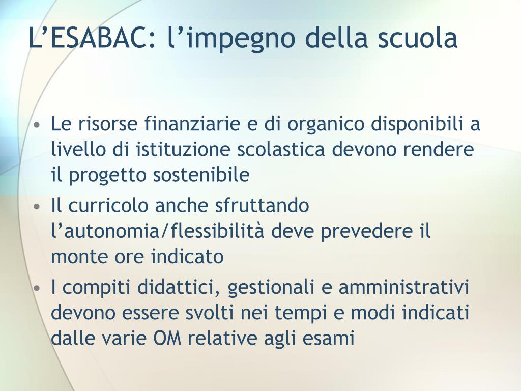L’ESABAC: l’impegno della scuola • Le risorse finanziarie e di organico disponibili a livello di istituzione scolastica devono rendere il progetto sostenibile • Il curricolo anche sfruttando l’autonomia/flessibilità deve prevedere il monte ore indicato • I compiti didattici, gestionali e amministrativi devono essere svolti nei tempi e modi indicati dalle varie OM relative agli esami