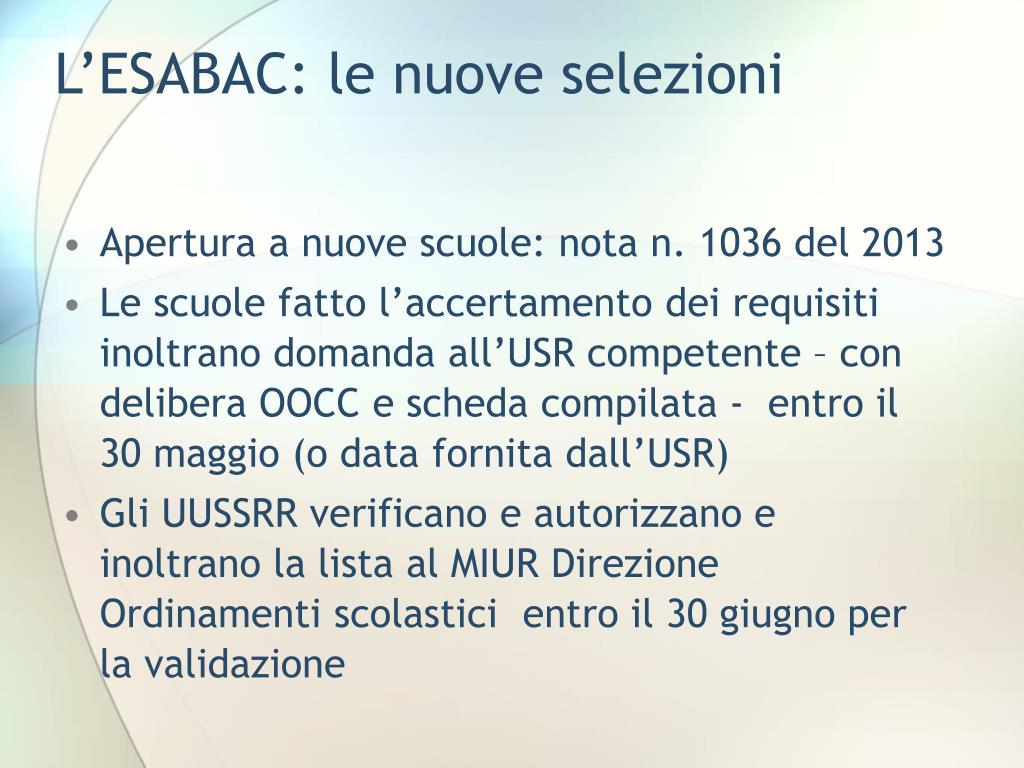 L’ESABAC: le nuove selezioni • Apertura a nuove scuole: nota n. 1036 del 2013 • Le scuole fatto l’accertamento dei requisiti inoltrano domanda all’USR competente – con delibera OOCC e scheda compilata - entro il 30 maggio (o data fornita dall’USR) • Gli UUSSRR verificano e autorizzano e inoltrano la lista al MIUR Direzione Ordinamenti scolastici entro il 30 giugno per la validazione