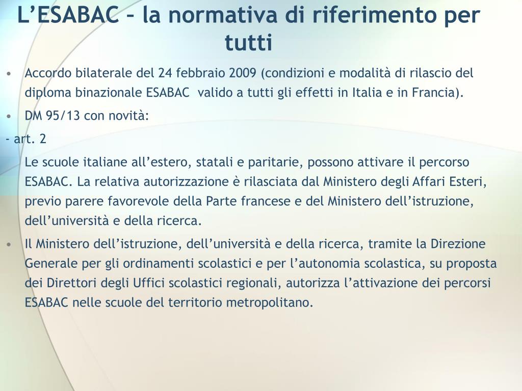 L’ESABAC – la normativa di riferimento per tutti • Accordo bilaterale del 24 febbraio 2009 (condizioni e modalità di rilascio del diploma binazionale ESABAC valido a tutti gli effetti in Italia e in Francia). • DM 95/13 con novità: - art. 2 Le scuole italiane all’estero, statali e paritarie, possono attivare il percorso ESABAC. La relativa autorizzazione è rilasciata dal Ministero degli Affari Esteri, previo parere favorevole della Parte francese e del Ministero dell’istruzione, dell’università e della ricerca. • Il Ministero dell’istruzione, dell’università e della ricerca, tramite la Direzione Generale per gli ordinamenti scolastici e per l’autonomia scolastica, su proposta dei Direttori degli Uffici scolastici regionali, autorizza l’attivazione dei percorsi ESABAC nelle scuole del territorio metropolitano.