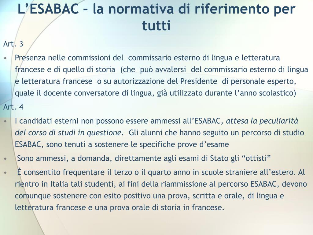 L’ESABAC – la normativa di riferimento per tutti Art. 3 • Presenza nelle commissioni del commissario esterno di lingua e letteratura francese e di quello di storia (che può avvalersi del commissario esterno di lingua e letteratura francese o su autorizzazione del Presidente di personale esperto, quale il docente conversatore di lingua, già utilizzato durante l’anno scolastico) Art. 4 • I candidati esterni non possono essere ammessi all’ESABAC, attesa la peculiarità del corso di studi in questione. Gli alunni che hanno seguito un percorso di studio ESABAC, sono tenuti a sostenere le specifiche prove d’esame • Sono ammessi, a domanda, direttamente agli esami di Stato gli “ottisti” • È consentito frequentare il terzo o il quarto anno in scuole straniere all’estero. Al rientro in Italia tali studenti, ai fini della riammissione al percorso ESABAC, devono comunque sostenere con esito positivo una prova, scritta e orale, di lingua e letteratura francese e una prova orale di storia in francese.