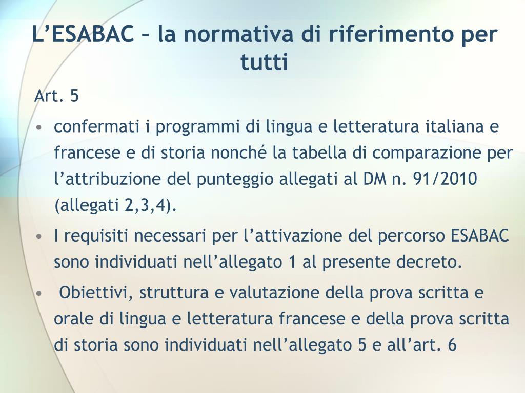 L’ESABAC – la normativa di riferimento per tutti Art. 5 • confermati i programmi di lingua e letteratura italiana e francese e di storia nonché la tabella di comparazione per l’attribuzione del punteggio allegati al DM n. 91/2010 (allegati 2,3,4). • I requisiti necessari per l’attivazione del percorso ESABAC sono individuati nell’allegato 1 al presente decreto. • Obiettivi, struttura e valutazione della prova scritta e orale di lingua e letteratura francese e della prova scritta di storia sono individuati nell’allegato 5 e all’art. 6