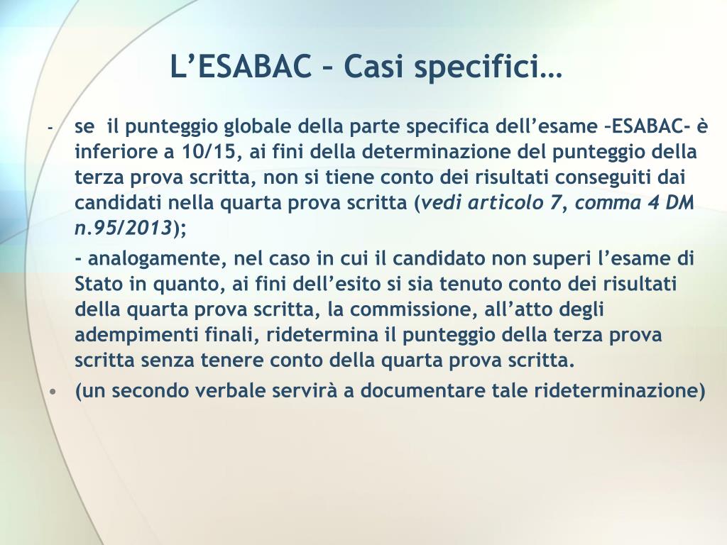 L’ESABAC – Casi specifici… - se il punteggio globale della parte specifica dell’esame –ESABAC- è inferiore a 10/15, ai fini della determinazione del punteggio della terza prova scritta, non si tiene conto dei risultati conseguiti dai candidati nella quarta prova scritta (vedi articolo 7, comma 4 DM n.95/2013); - analogamente, nel caso in cui il candidato non superi l’esame di Stato in quanto, ai fini dell’esito si sia tenuto conto dei risultati della quarta prova scritta, la commissione, all’atto degli adempimenti finali, ridetermina il punteggio della terza prova scritta senza tenere conto della quarta prova scritta. • (un secondo verbale servirà a documentare tale rideterminazione)