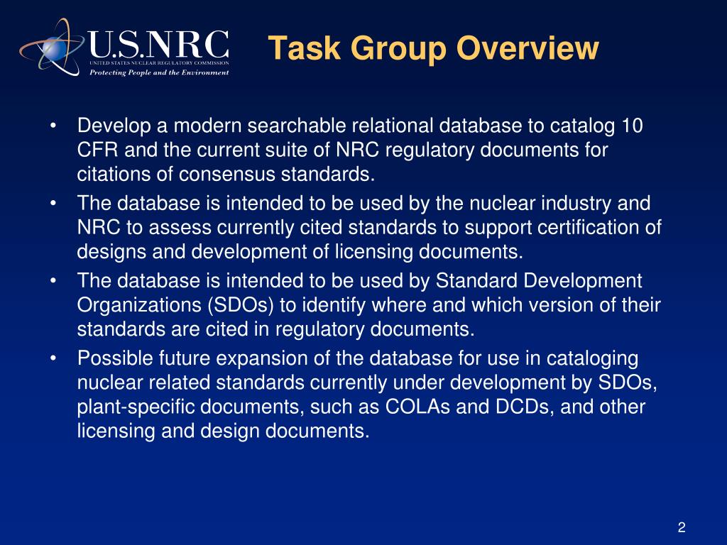 Task Group Overview • Develop a modern searchable relational database to catalog 10 CFR and the current suite of NRC regulatory documents for citations of consensus standards. • The database is intended to be used by the nuclear industry and NRC to assess currently cited standards to support certification of designs and development of licensing documents. • The database is intended to be used by Standard Development Organizations (SDOs) to identify where and which version of their standards are cited in regulatory documents. • Possible future expansion of the database for use in cataloging nuclear related standards currently under development by SDOs, plant-specific documents, such as COLAs and DCDs, and other licensing and design documents.